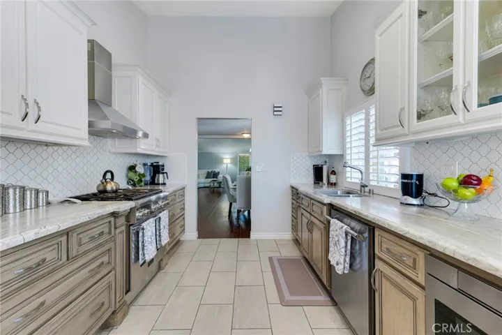 The well-appointed kitchen offers ample cabinetry, elegant marble countertops, stainless steel appliances, and a charming breakfast nook ideal for casual dining.