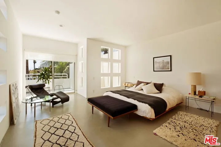 Townhouse in Venice – A Masterpiece by Ted Tokyo Tanaka, FAIA, 1989. This unique townhouse is in the thriving heart of Venice Beach. Around the corner, on Abbot Kinney Blvd. is a vibrant scene of shops, cafes, and restaurants, with the Beach and Main Street a few blocks away. One of four units, reflecting a disciplined architectural approach that evokes French, Spanish, and Bauhaus Modernism, this building creates a captivating visual interplay of light and shadow. The facade enhances an aesthetic appeal, offering a serene and private balance, a quiet street presence. Surrounded by a lush, mature garden, entry is through a private gated front patio that wraps around this corner unit. The entrance opens to over 20 ft. high ceiling living room defined by volume, proportion, and detail reveals majestic open plan living. The split level plan unfolds, with a mezzanine loft overlooking a semi open custom built kitchen, high end appliances, with a Scandinavian influence. Metal casement windows frame shifting light throughout the day. Two bedrooms feature large versatile rooms, double height ceilings, en-suite bathrooms and spacious balconies. The third bedroom is on a separate level with an adjoining bathroom.