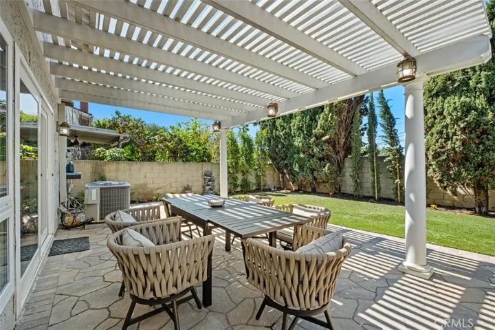 The exterior is equally impressive, with one of the larger lots in the community, beginning with a charming paved courtyard & new entry door. The extended backyard is designed for both relaxation and entertaining, featuring 2 spacious paved patio areas with an aluminum pergola cover, artificial turf, refreshed landscaping & a drip irrigation system.