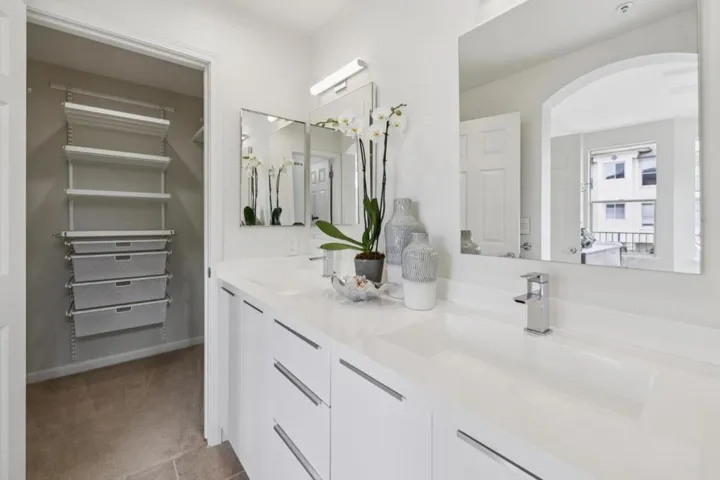 Updated modern condominium in Ventana del Mar on Redwood Shores Lagoon. Featuring a sought-after split-bedroom floor plan, this unit with two bedrooms and bathrooms centers on an open-concept living space. The open living and dining areas enjoy the warmth of a cozy fireplace and cool breeze from the balcony. The streamlined kitchen, boasting chic cabinets, quartz counters, and stainless steel appliances, overlooks the living space via a dining counter, perfect for entertaining. The primary suite offers a serene retreat with an array of windows and reading nook, a modern bathroom with double-sink vanity, and a walk-in closet with Elfa storage. A second bedroom with an adjacent bath, plus in-home laundry, adds ultimate convenience. Residents enjoy resort-style amenities, including a waterside pool, spa, fitness center, clubhouse and access to shoreline walking paths. Come live the dream!
