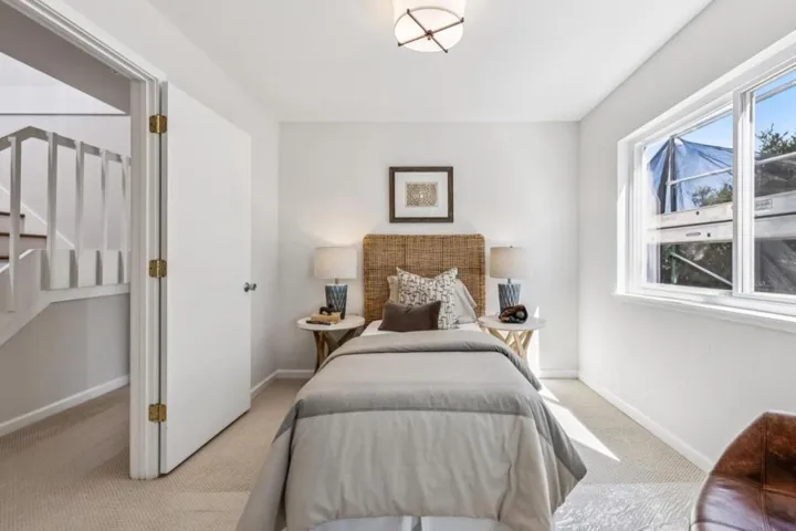 Canyon views and utmost privacy in a quiet hillside setting in the lovely Haskins Estates neighborhood. Nestled among the trees is an alluring home with a Modern Craftsman facade, and a refreshed landscape with spring flowers and a captivating approach to the front entrance. Enter the striking interior and find a large open living area with stunning views that will give you pause. Enjoy the freshly painted interior with beamed ceilings, refinished hardwood and slate-lined floors, newly carpeted bedrooms, and a bounty of sparkling windows and glass doors showcasing views, and opening to new decks with cable railings. Framed by tranquil vistas, the living and dining areas extend to the upper deck via French door, while the kitchen, with dining island, stainless appliances and casual dining area, has a sliding glass door to the same deck. Lower levels comprise four bedrooms, including a primary suite with private deck, and a flexible guest suite with private entrance. A secluded office with walk-in storage is a bonus. Balancing modern living with down-to-earth style, this home has the lure of seclusion, yet is < 3 miles from The Village, Caltrain, Hillsdale Shopping and top-rated schools.