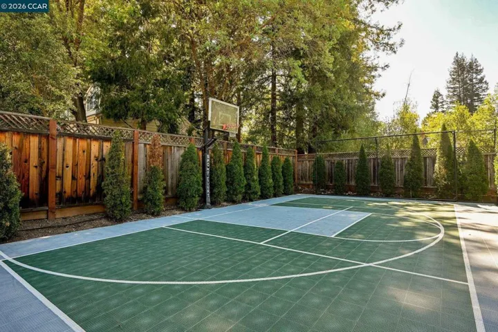 Phenomenal Diablo Estate on a highly desired street, close to the club! Timeless Spanish architecture updated & enhanced with modern Santa Barbara Mission style flair and livability. This home offers tremendous quality and finishes throughout. As a highlight, it provides mostly ONE STORY living aside from two large upper level, versatile bonus spaces both with full bathrooms. One has a separate entrance and the other has a walk-out deck to enjoy the stunning yard. From the glamorous first impression to the large, light-filled spacious rooms, high-end cook’s kitchen, 800 bottle wine closet, wide plank Walnut floors and lovely, hardy molding and beams throughout, this house suits our California lifestyle. The primary suite is stunning, featuring a spa-like bathroom and an enormous walk-in closet. Two large auxiliary bedroom suites, an executive office, a private guest room, a stunning dining room, a gracious living room, wonderful kitchen and family room are on 1st floor. The resort like backyard includes a pool, spa, covered loggia, outdoor kitchen, fireplace, sport court, putting green & garden. The property has a gated circular driveway, a 3 car attached & 2 car detached garage w/heat, air and full bath. OPEN SAT 1:30-4PM. Extra parking in driveway off Palma Vista