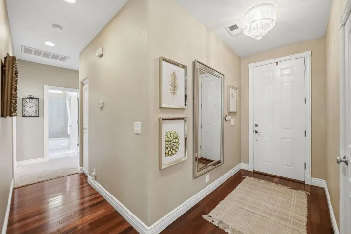 Rare single-story model in the desirable Central Park community, located in the heart of Morgan Hill. This home features a large kitchen with quartz countertops, stainless steel appliances, gas range, and recessed lighting. Rich hardwood floors, accent paint, and high vaulted ceilings create a warm and inviting atmosphere, complemented by built-in cabinetry for a TV and entertainment system. Energy-efficient upgrades include a tankless water heater and owned solar. Enjoy low-maintenance living with HOA-maintained front landscaping, along with access to fantastic community amenities including a pool, spa, park, basketball, and tennis courts just a short 2-minute walk away. The quiet, friendly neighborhood offers a true sense of community, and a large fenced grassy area is perfect for dogs, outdoor activities, and socializing. The backyard is ideal for entertaining, making this a wonderful place to call home.