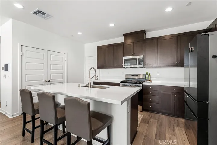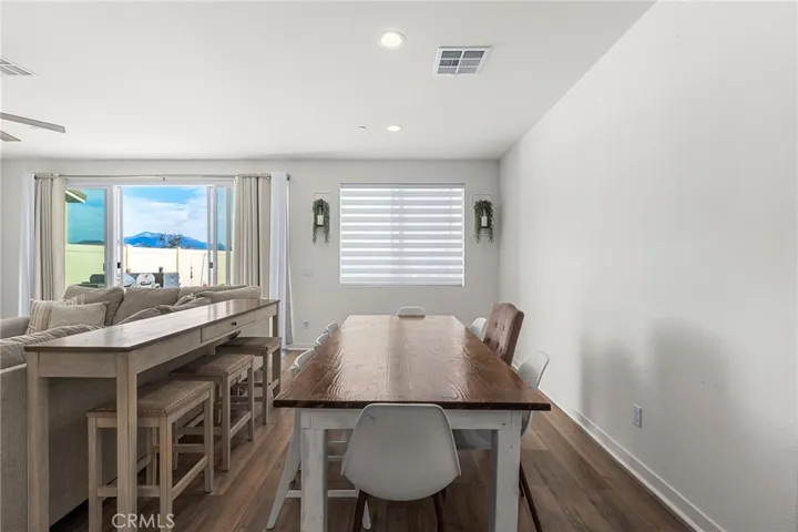 The kitchen offers a large island, ample cabinetry, and a double door pantry, seamlessly connecting to the dining and living areas. A stunning 12 foot center opening sliding glass door enhances the space, creating seamless indoor outdoor living and leading to the fully finished backyard.
