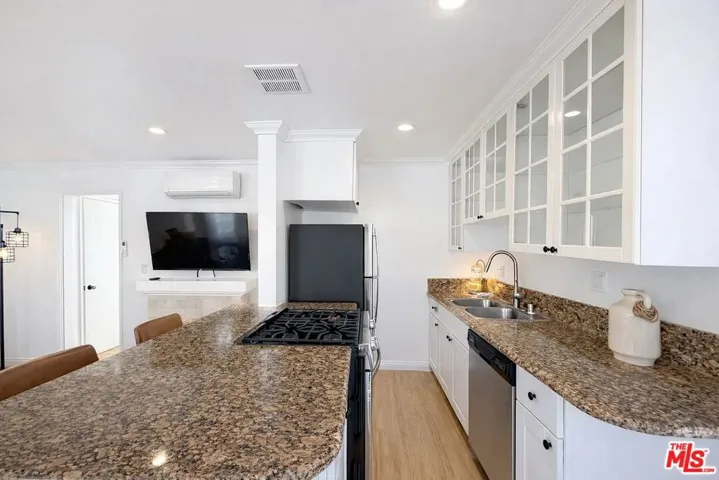 Gorgeous & bright 1Bed/1Bath upstairs unit at 10th & Wilshire Second floor with no one above Corner unit, West facing with amazing natural light Newly renovated kitchen granite countertops & glass front cabinetry Excellent cabinet storage All stainless steel appliances with gas range, dishwasher, and double sink Breakfast bar seating Split system A/C, one unit above faux fireplace and one unit in bedroom Beautiful courtyard with rose gardens and a fountain Large grassy front yard Tumbled marble bathroom with shower tub combo Beautiful casement windows Great closet space Washer/Dryer combo in hallway closet Street parking (permit required from City; very easy on this block)Recessed lighting in every room Hardwood floors throughout Gated property