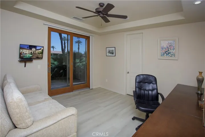 Bermuda Dunes CC – Castle Harbour. This residence occupies a truly rare position, defined by approximately 309 feet of golf course frontage spanning two fairways and a highly sought after south facing orientation, delivering all-day natural light and warm sun filled rear exposure across the pool, outdoor living areas, and primary interior spaces. Set on a premier corner lot overlooking the par-3, 7th hole of the Classic Course, the home captures an ever changing canvas of multiple fairways, the 7th green, and the Santa Rosa Mountains. The home is intentionally designed so that every primary living space opens to golf course views, creating a seamless connection between interior spaces and the surrounding landscape. Recently refreshed with a curated palette of new interior paint and updated flooring, the home presents a renewed sense of cohesion and sophistication, allowing its architectural scale and setting to take center stage.