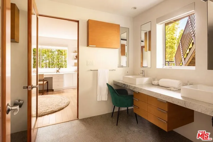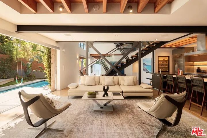 Tucked away on a cul-de-sac and designed by Melinda Gray, AIA, this Santa Monica Canyon architectural offers curated, dreamy moments, clean lines, lofty ceilings, and an expert use of space at every turn. With a focus on an indoor-outdoor lifestyle optimized, large pocket doors and walls of glass disappear to provide elegant harmony with the home’s natural surroundings. Glossy wood floors flow throughout each of the entertaining spaces, from the picturesque formal dining room to the living room with the striking staircase as its centerpiece. Exposed wood and steel beams contrast above an important stone fireplace as floor-to-ceiling windows showcase lush greenery. The open commercial-style kitchen is appointed with a massive island with bar ledge and chef-grade cooktop with hood, state-of-the-art Miele appliances, and copious counter preparation space. Outside, verdant ivy flourishes as it climbs the exterior’s smooth concrete, softening the industrial-chic vibe. Sway on clever swing seating, relax in the pool with water feature and spa, or converse and entertain guests around the terraced fire pit and conversation table shrouded in leafy, tropical greenery. Upstairs, the primary suite has high ceilings, private balcony access, walk-in closet with built-in storage, and a bathroom with floating dual-sink vanity, separate soaking tub, and glass-enclosed rainwater steam shower. A vast junior primary suite, also with a spa-like bath, has a built-in L-shaped desk for study and play plus a sliding door to its own sunny platform overlooking the grounds below. Secondary bedrooms and bathrooms are well-considered and feature built-ins and design elements that continue the home’s theme. There is also a loft-style bonus area with built-ins for use as a library, reading nook, yoga, media, or anything imaginable, all lit by natural light. On the lower level, discover a game room with herringbone flooring and a secret door which opens to a hidden theatre for screening films! Welcome to the best location where Santa Monica meets the Palisades, close to world-famous beaches stretching from Malibu to the marina, the pier, parks, boutiques, ten-rated Canyon Elementary, fine dining, and all that makes the Westside such a perfect place to be.