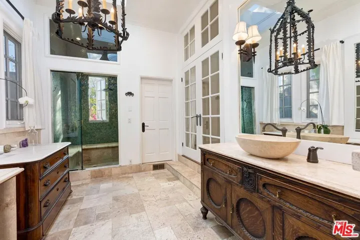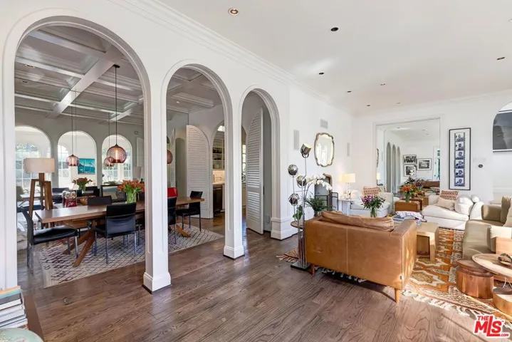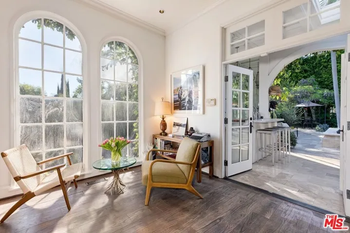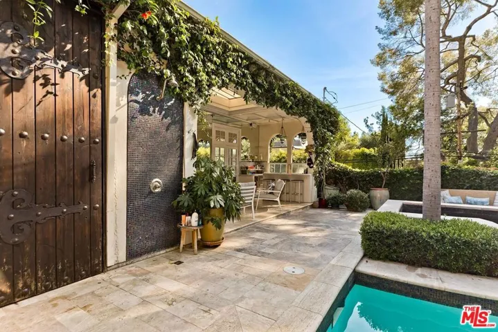 Elegant Mediterranean estate designed by acclaimed builder-architect Fred Smathers, located in the prestigious Upper Nichols Canyon neighborhood. An open-concept living and dining area showcases Smathers’ signature arches and expansive windows, seamlessly blending indoor and outdoor living. Step outside to a spectacular entertainer’s retreat featuring a pool, spa, outdoor shower, and bar, along with a covered patio highlighted by a striking fireplace, perfect for year-round enjoyment. This stylish residence offers 3 bedrooms and 5 bathrooms, including a luxurious primary suite with direct access and a beautifully appointed ensuite bath. The lower level features a plush home theater and a dedicated gym, providing ideal spaces for relaxation and wellness. A newly renovated laundry room adds both convenience and charm. Soaring ceilings throughout enhance the home’s light-filled, sophisticated ambiance, creating a truly exceptional living experience.