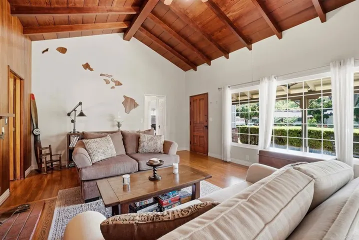Nestled at the base of Mount Helix on an expansive and mostly level half-acre corner lot, this classic mid-century ranch blends timeless architectural character with meaningful modern upgrades. Originally built in 1952, the home showcases signature post-and-beam construction, rich wood detailing, and a striking vaulted ceiling that creates warmth and volume throughout the main living spaces. A welcoming veranda entry opens to a light-filled living room centered around a cozy wood-burning fireplace, flowing seamlessly into the formal dining area—ideal for both everyday living and entertaining. Large windows frame serene, park-like views of the surrounding landscape, enhancing the home’s indoor-outdoor connection. The property’s generous lot offers endless potential—whether you envision expanding, adding a pool, creating an ADU, or simply enjoying the privacy and space rarely found in this sought-after La Mesa enclave. Modern efficiency meets classic design with a brand new HVAC system, including both A/C and furnace replaced approximately one year ago. The home is also equipped with solar and battery backup, helping reduce energy costs while providing added reliability and peace of mind. Located in the desirable Mount Helix/Fuerte area, this home presents a unique opportunity to enjoy classic design with room to personalize, all within a peaceful, established neighborhood just minutes from shopping, dining, and freeway access.