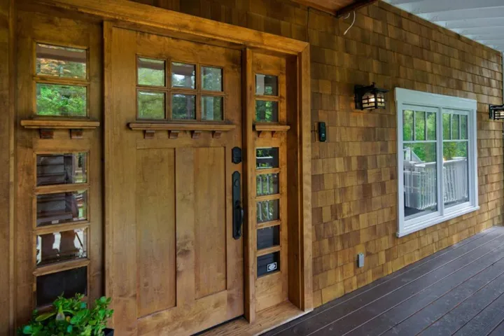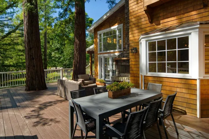 This masterwork of “ultimate bungalow” design evokes the spirit of the iconic Gamble and Gamble, honoring the Arts and Crafts movement’s devotion to natural materials and visible joinery. This hand-crafted sanctuary offers a seamless transition from the wild creek-side environment to a sheltered interior. Clad in traditional cedar shingles with overhanging eaves, the home sits in organic harmony with its acre lot. An 18-foot ceiling anchors the Great Hall, its massive scale made intimate by hand-finished built-ins and intricate millwork. From the elegant dining room wainscoting to custom cabinetry, every detail celebrates “honesty of construction.” The expansive canopy deck preserves two ancient redwoods that rise through the decking to create a living ceiling, a direct nod to building around nature. The architecture is a dialogue between forest and floor plan. The open-concept kitchen, with Wolf, Viking, and Sub-Zero appliances, integrates into a timeless space illuminated by lighting that highlights natural textures. True to the Craftsman ideal, French doors in the living room, primary suite, and massive upstairs loft dissolve the boundary between shelter and garden. Modern necessities, a Tesla charger, and turf lawn are implemented with a focus on environmental stewardship.