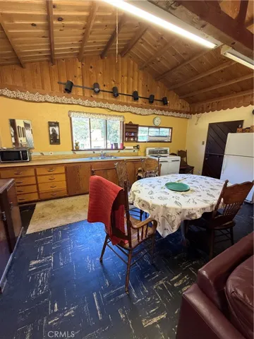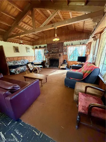 A long dirt drive leads into the heart of the property, where a 1954 ranch-style cottage sits beneath towering trees. The home offers approximately 848 square feet with 1 bedroom and 1 bathroom, featuring vaulted wood ceilings and an open living space. While the home is ready for renovation, it provides a strong foundation for restoration or the opportunity to build something new.