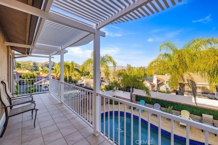 Welcome to this beautifully maintained two-story pool home in the highly desirable Bravo tract of Castaic’s scenic hillside community. Showcasing pride of ownership throughout, this residence offers an ideal blend of comfort and functionality. Attractive curb appeal opens to a light-filled interior featuring soaring ceilings, a dramatic spiral staircase, and a formal living room with clerestory windows. Custom hardwood flooring enhances the open floor plan. The formal dining room features French doors to the backyard, while the upgraded kitchen offers ceramic tile flooring, abundant cabinetry, granite countertops with high backsplash, breakfast bar, newer stainless steel gas range and microwave, and a large bay window overlooking the pool. A casual dining area with additional French doors creates seamless indoor-outdoor flow. The family room includes a custom fireplace, built-in entertainment centers, and storage beneath the staircase. A guest powder room completes the main level. Upstairs, the spacious primary suite features two closets, a large retreat with walk-in closet (builder option for a fourth bedroom), and sliding doors to a private balcony with mountain and the stunning backyard views. The updated ensuite includes a dual-sink vanity, oversized jetted soaking tub with shower, private water closet, and custom organizers. Two additional bedrooms and an updated bathroom complete the second floor. The backyard is a private oasis with a covered patio featuring recessed lighting and ceiling fan, concrete hardscape, sparkling Pebble Tec pool and spa with upgrades, and a custom gazebo with gas grill, sink, and counter space. Additional features include dual-pane windows, whole house fan, tankless water heater, plantation shutters, crown molding, ceiling fans, new toilets, oversized A/C unit, newer gutters and downspouts, upgraded pool equipment, new sprinkler system, and automatic pool water leveler. No HOA or Mello-Roos. Conveniently located near Castaic Lake, shopping, dining, schools, and freeway access.