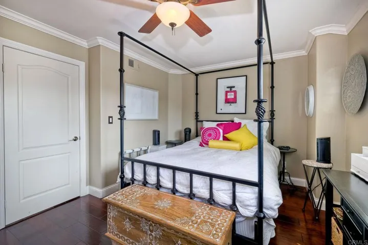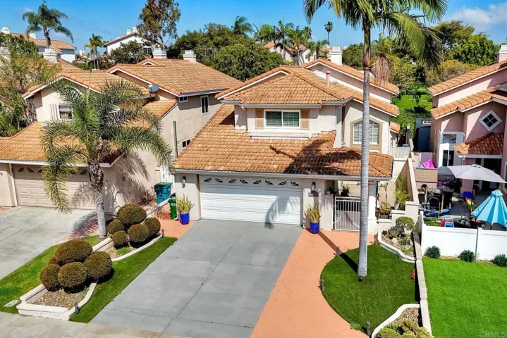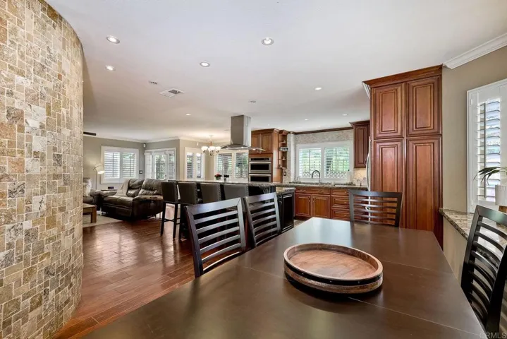 This home features a reimagined open-concept layout created by removing three walls between the kitchen, dining, and family room adding approximately 60 square feet and creating a bright, seamless great room ideal for everyday living and entertaining. The centerpiece kitchen offers a walk-around island with Bosch cooktop, breakfast bar seating, and rich walnut cabinetry with pull-out drawers, roll-outs, and lazy Susan. Chiseled-edge granite counters, stacked stone backsplash, and stainless steel Bosch and KitchenAid appliances complete the space. Scraped walnut engineered hardwood floors, crown molding, baseboards, skylights, and custom lighting enhance the light-filled interior. The family room includes built-in BOSE surround sound. The primary suite features a fireplace, dual vanities, soaking tub, separate shower, and walk-in closet. A Jack-and-Jill bath connects two bedrooms (one converted to a custom closet), plus a downstairs bedroom and full bath offer flexible living. Unique touches include a Travertine mosaic staircase, custom handrails, and numerous upgrades throughout—dual-pane windows, plantation shutters, A/C, whole-house fan and more. Outdoor spaces feature pebble paving in the front courtyard and backyard, tropical landscaping, and a gated entry. The garage offers wall-to-wall built-in storage cabinets. Located in Rancho Del Oro’s Villa Trinidad community with nearby park and tot lot, just minutes to shopping, dining, and Oceanside beaches.
