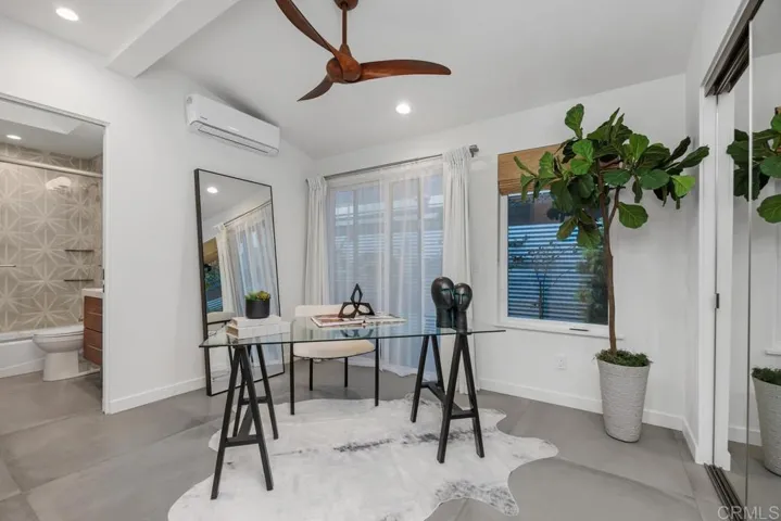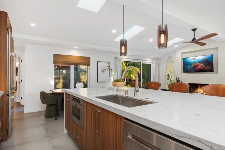 Turnkey Single-Level Encinitas Retreat Quality Renovation Completed in March 2026, this stunning single-level modern residence is the definition of coastal luxury. Set on an elevated 10,000 sq ft view lot, the home captures serene coastal sightlines and ocean-air breezes while offering seamless indoor-outdoor living from every room. Step through the pivoting front door into an expansive great room with vaulted skylit ceilings, custom ceramic Italian floor tiles, a natural gas fireplace and dramatic triple sliding glass doors on both the east and west sides—opening fully to a large central patio ideal for entertaining, sunset dining, or quiet mornings. The chef’s kitchen is a showpiece, anchored by a large satin-finish quartzite island with waterfall edges, walnut look cabinetry and equipped with a top-tier Dacor stainless appliance suite. Three bedrooms, each with its own sleek ensuite bathroom, custom built in closet and private patio access, creating an effortless flow to the wraparound view patios that surround the property. Convenient guest powder room off great room. Transitioning seamlessly from indoor to the outdoor spaces, patios feature silver smoke concrete patios accented with aggregate borders and black beach pebbles, enhanced by 2 firepits, 2 water features, low-voltage landscape lighting and lush landscaping throughout—creating a tranquil, resort-like setting day and night. Covered parking for 2 cars and an additional 3 uncovered spaces make for ample parking capability. 12×15 storage building allows for additional storage. Adding exceptional flexibility, the 393 sq ft attached ADU offers its own off street private entry, two private patios, an outdoor surfer’s shower, skylights, built in closet, spacious modern bathroom, sleek stainless kitchen with walnut look cabinetry, outdoor Caribbean bar and quartzite counters. The ADU is ideal for guests, rental income, or multigenerational living. This ADU can be modified to be accessed from within the main home. Building plans have been submitted to the City for a detached 1,148 sq ft 2 bedroom, 2 bathroom additional ADU with a very MCM post & beam design positioned on the highest portion of the parcel with potential sunset/horizon/ocean views. Plans will convey to the buyer. Ideally located in the heart of Encinitas, just minutes from beaches, Batiquitos Lagoon, parks, restaurants, shopping, La Costa Resort & Spa, Encinitas Ranch Golf Course, Vista Ridge Hiking Trail, Fox Point Farms, San Diego Botanic Garden, YMCA, Ecke Sports Park, and Coastal Roots Farm.