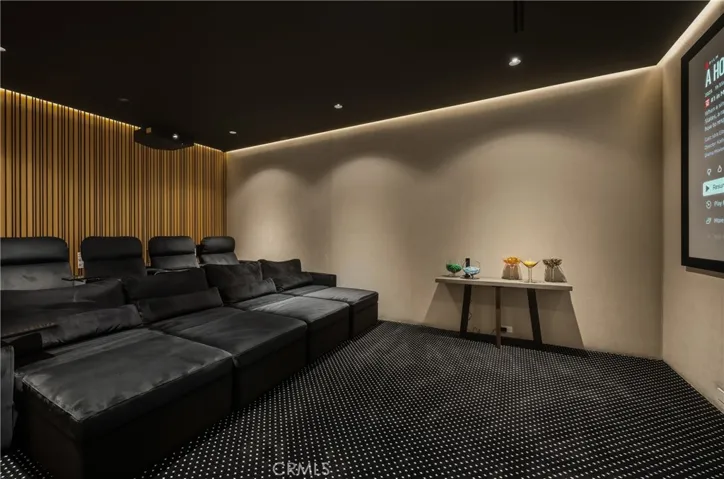Entertainment reaches new heights with a private movie theater and a stunning outdoor environment. The cabana—with a full outdoor kitchen and BBQ—is ideal for hosting or relaxing. Car enthusiasts will appreciate the 13.6-ft RV garage with hookups, the attached two-car garage, and an additional two-car garage in the backyard. An electric automatic pocket door offers seamless access to the outdoor spaces.