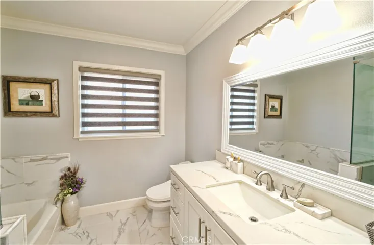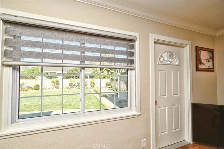 The modern kitchen is equipped with stainless steel appliances, upgraded countertops, and stylish cabinetry that continues into the bathrooms. Additional upgrades include a newer roof, double-pane windows throughout, fabric window blind throughout and a newer central air conditioning system with updated ductwork for year-round comfort. Third bedroom, making it perfect as a den or office. All bedrooms include ceiling fans, crown molding, and custom mirrored closet doors with built-in organizers. The large bathroom featuring a bathtub and a custom glass-enclosed shower. Durable SPC waterproof flooring runs throughout the home, a newer water heater. The inviting living room showcases a unique wood-paneled ceiling with a clean white finish. It opens through sliding glass doors to a beautifully landscaped backyard—perfect for entertaining—with a custom patio ideal for BBQs and relaxation. Front and backyard feature attractive brickwork, automatic sprinklers, and fruit trees. The extra-wide driveway accommodates up to 4 cars or an RV with ease.