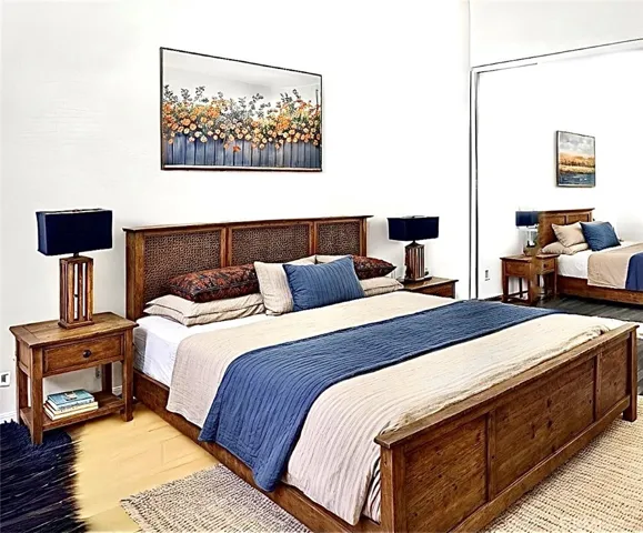 The primary suite offers a restful sanctuary, complete with a generous walk-in closet and refined finishes throughout. Secondary bedrooms are thoughtfully appointed with laminate flooring, faux wood blinds, and distinctive closet detailing, each space offering comfort and versatility.