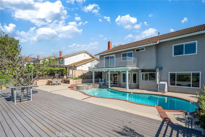 Step outside to a beautifully maintained backyard featuring a sparkling pool with diving board and an expansive deck that enhances outdoor living space. Mature landscaping with a variety of plants and fruit trees creates a serene and welcoming atmosphere.
