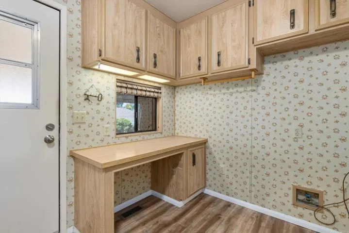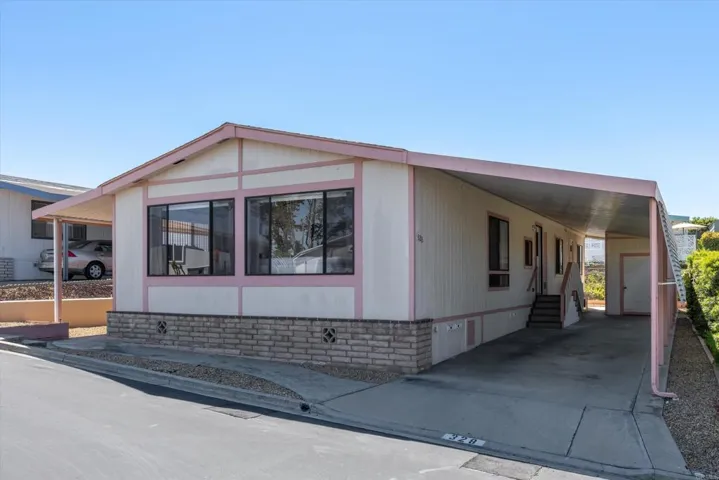 Welcome to resort-style living in the highly desirable 55+ community of Rancho Vallecitos—offering city rent control and an exceptional lifestyle filled with amenities and social opportunities. This inviting home features vaulted ceilings, a drywall interior, and durable hard-surface flooring throughout, creating a bright and low-maintenance living environment. The spacious kitchen is equipped with stainless steel appliances, abundant cabinetry, and generous pantry storage. An oversized laundry room with built-in desk and cabinetry provides the ideal flex space for a home office, hobby area, or additional storage. Built-ins throughout the home ensure everything has its place. The primary suite offers a comfortable retreat with a walk-in closet and an ensuite bathroom featuring both a separate soaking tub and walk-in shower. A spacious guest bedroom adds flexibility for visitors or additional workspace. Step outside to enjoy a private covered patio set behind the front porch, along with a low-maintenance turf yard—perfect for relaxing or entertaining. A large storage shed adds even more convenience. Residents of Rancho Vallecitos enjoy access to a beautifully maintained, 5-star community featuring a clubhouse, pool and spa, fitness center, library, billiards room, game and craft spaces, putting green, dog park, and optional RV parking. With a current monthly space rent of $706.32 and the benefit of city rent control, this home offers both comfort and long-term value.
