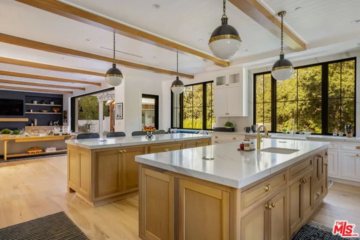 Set at the end of a quiet cul-de-sac on a coveted corner lot in Royal Oaks, this expansive newer-construction residence offers a rare combination of scale, privacy, and thoughtful design in one of Encino’s most sought-after neighborhoods. From the moment you enter, the home feels open, elevated, and effortlessly livable. Soaring cathedral-height ceilings with exposed beams, oversized proportions, and abundant natural light define the main living spaces. Designed for both entertaining and everyday living, the two-level floor plan flows seamlessly from formal living and dining rooms into a generous great room with fireplace and sliding pocket glass doors that open to the backyard. The show-stopping chef’s kitchen anchors the home with two substantial islands, a walk-in pantry, premium appliances, cozy eating area and ample space to gather with ease. Every living space feels intentionally oversized, including a dedicated home theater, library or study, private office, and a striking walk-in wine cellar. All five bedrooms are en suite, with three spacious secondary suites upstairseach offering walk-in closets and access to upper-level balconies. The primary suite is a true retreat, complete with a sitting room or office, a dramatic two-sided fireplace, and a spa-inspired bath finished in Carrera marble. Outdoors, the property transforms into a private, resort-style setting featuring an oversized turf lawn, expansive patio, fire pit, built-in BBQ, pool house, and a heated infinity-edge pool and spa ideal for year-round enjoyment. Additional highlights include dual-zone HVAC, security and alarm systems, and a three-car garage with glass doors. Ideally located within the Lanai Road Elementary School District and moments from studios, dining, shopping, canyon roads, and major freeways, this home delivers refined Encino living at an exceptional scale.