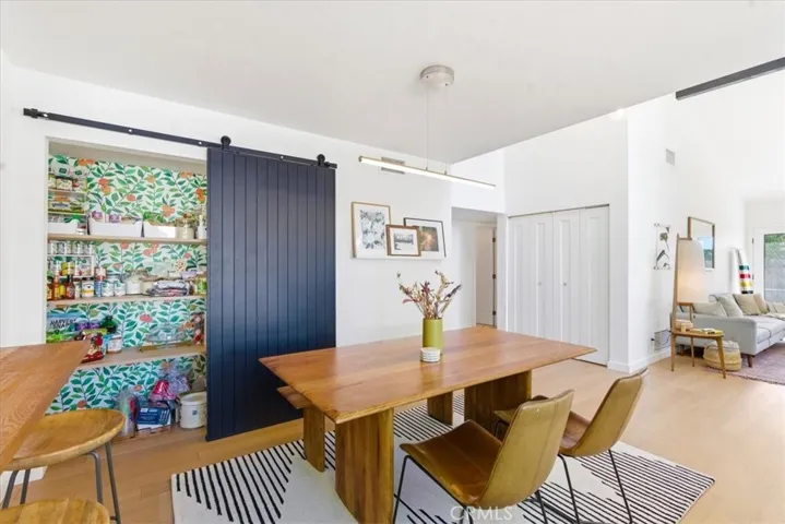. Soaring cathedral ceilings and abundant natural light enhance the home’s open, airy feel, while curated lighting from West Elm and custom fixtures add a refined, designer touch throughout. The thoughtfully designed kitchen is both functional and stylish, featuring mid-century modern cabinetry paired with warm white oak butcher block countertops, solid brass hardware & a large pantry. A suite of premium appliances includes a Bertazzoni Italia refrigerator, Frigidaire induction range/oven, KitchenAid dishwasher, GE microwave, & a stainless steel sink—delivering performance & modern convenience.