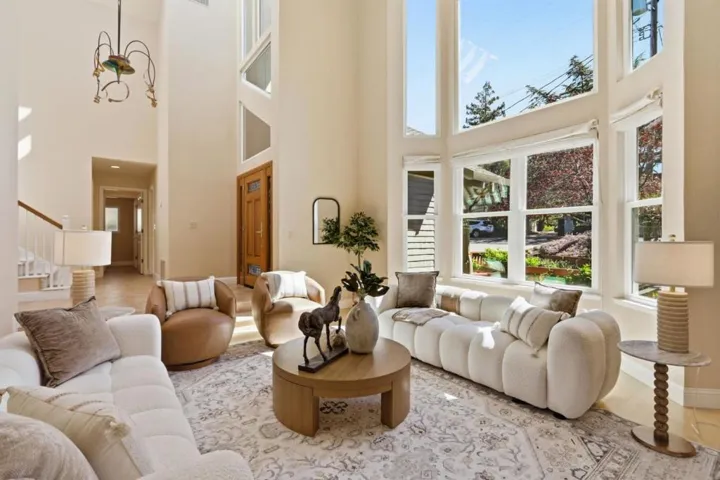 Open loft currently staged as an office/den is perfect 4th bedroom! A peaceful retreat on a quiet street just minutes from downtown Los Gatos. Beautifully designed and meticulously maintained, exceptionally bright home offers vaulted ceilings, multiple outdoor living areas and serene mountain views. Look up! The dramatic two story entry features a stunning ceiling of skylights and an artesian chandelier! Elegant living room with a marble fireplace. An updated kitchen is perfect for entertaining and features granite counters, a large center island with breakfast bar, GE Monogram built-in SS refrigerator/freezer, Thermador gas range, Bosch dishwasher, 2 sinks,& abundant custom cabinetry. Primary suite offers a private sitting area, vaulted ceilings, an enormous bath with dual vanities, Jacuzzi tub, skylights, and walk in closet complete with beautiful closet organizers. Yes! There’s an attached 2 car garage; this home has it all! Outdoor living includes wraparound redwood decking, a private slate patio with fire pit, and beautifully landscaped grounds with mature oak trees. Additional features include central heat and A/C, dual pane windows, don’t miss the walk-in attic off primary bath.