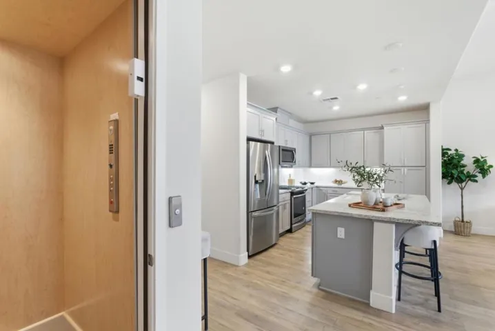 A built in 2021 modern stylish townhome style condo home is located at Mission Falls 55 year old plus community in the desired Warm-spring district. 2 bed 2 bath 1,515 SqFt living space, equipped a private in-house elevator. Open kitchen floor plan, central island, Gas burned stove, Stainless steel appliances, Inside laundry with washer & dryer. Double pane windows, Central HVAC, Owned Solar Power System, high-end shutters, Recessed lights, SmartHome control System, Waterproof laminated floors through out. One Car attached garage, Tesla Charger is ready, water-filter softener system. Low HOA, closed to Ranch 99 & Lion Chinese Super Markets, Osaka Japanese Super market, Safeway, restaurants, BART Station, Top rated WarmSpring schools, Tesla, Cisco major high-tech companies. Easy to access the HYW 880, 680 & 237.