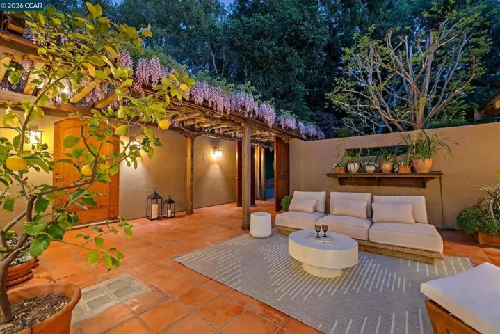 Arrive beneath a canopy of blooming wisteria & step into a private courtyard where a stone fountain and flowering vines set the tone for this architecturally singular Santa Barbara inspired retreat. Set among ancient oaks with sweeping valley views, this 4,112 sq ft masterwork offers 4 beds + office, 3.5 baths, and a 3-car garage. Soaring vaulted ceilings, hardwood floors, sculpted archways, and a dramatic kiva fireplace anchor the living room. The updated chef’s kitchen flanked by a formal dining room and sun-drenched breakfast room, both with valley views, offers stainless appliances, new countertops & tile backsplash as well as a center island and Spanish tile floors. Fabulous indoor/outdoor flow from the kitchen to the entry courtyard as well as the access from the generous family room via French doors to sweeping treetop decks with a hot tub. The serene primary suite offers a fireplace & private balcony nestled into the oak canopy. There is a second en-suite bedroom on the main level that is outfitted with built-inn desks & a murphy bed offering flexibility. Set in the Orinda Woods HOA which includes pool, tennis courts, BART shuttle & more. This location is a 10! Minutes to downtown Orinda’s farmers market, shops, restaurants, commute top-rated K–12 schools. Welcome Home!