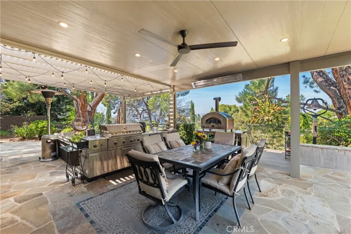 This absolutely stunning 4 bedroom, 3 bath, gated view home truly leaves nothing to be desired. A stone driveway and winding path lead to a custom glass front door, opening into a beautifully renovated single story home that seamlessly blends elegance and comfort. The dramatic two-story living room features an artistic spiral staircase leading to a loft, creating a striking architectural focal point. The gourmet kitchen, renovated in 2025, is a chef’s dream, showcasing top-of-the-line Thermador appliances, sleek porcelain countertops, and an oversized center island with a breakfast bar. Expansive corner windows frame breathtaking views and effortlessly bring the outdoors inside. The kitchen opens to a spacious family room, warmed by a cozy fireplace—perfect for everyday living and entertaining. Wide-plank wood flooring and travertine flow throughout the home. Double doors welcome you into the serene primary suite, complete with a generously sized, custom-built closet. The spa-inspired primary bathroom, renovated and gorgeous, features quartz countertops, dual sinks, and a luxurious steam shower with dual shower heads. This home boasts numerous upgrades, including owner-paid in full solar with a battery backup, updated pool equipment and lighting, electrical panel, intercom and cameras, a newer 2026 roof, and more. The incredible covered outdoor kitchen completed in 2025, offers heating and a ceiling fan, allowing for year-round enjoyment. Private and serene, the grounds are nothing short of magical, day and night. Watch breathtaking sunsets, gather around a fire pit with built-in seating, take a refreshing dip in the Pebble Tech pool, or unwind in the tranquil spa. As you wander this very private property, you’ll discover something special in every corner. Mature, arboretum-like landscaping reminiscent of the LA Arboretum creates a truly unforgettable setting. This property is part of the Bon Vivant Community and has access to Tennis Courts, a community pool and clubhouse with incredible views of the San Fernando Valley!