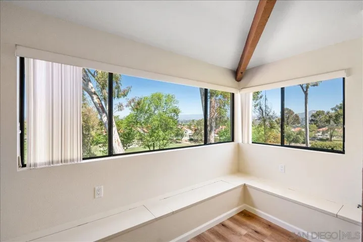 Tucked within the highly desirable Bernardo Heights community of Rancho Bernardo, this beautifully updated single story, end-unit residence offers the perfect blend of comfort, style, and resort-like living. With no neighbors above, this 2-bedroom, 2-bath home features a light-filled open layout enhanced by vaulted ceilings. The living room is a true focal point of the home, showcasing breathtaking panoramic views of Rancho Bernardo, The Heights Golf Club and the distant mountains. Large windows fill the space with natural light, while a cozy fireplace creates an inviting atmosphere for relaxing or entertaining. A charming built-in window seat adds both character and functionality, offering additional seating to enjoy the breathtaking panoramic views, creating a serene backdrop for everyday living. The spacious and bright primary suite continues the experience, featuring the same stunning views and providing a peaceful, private retreat. The room has a large closet and en-suite bath with dual sinks and walk-in shower. The second bedroom is generously sized, making it perfect for residents, guests, a home office or extended family, while the adjacent second bathroom offers convenient access for visitors. A separate dining room with light filled windows is adjacent to the living area and the beautifully refreshed kitchen complete with new stainless-steel appliances, sleek quartz countertops, and modern finishes. Additional highlights that elevate the home’s appeal include new luxury vinyl plank flooring in the main living areas and new carpet in the bedrooms. A spacious 2-car garage adds convenience and storage. Home is located within the award-winning Poway Unified School District. Residents enjoy access to the Community Association of Bernardo Heights, offering resort-style amenities such as a clubhouse, pools, spa, fitness center, tennis and pickleball courts, basketball hoops, outdoor grilling areas, and more, along with access to nearby Lucido Park. This move-in-ready home presents a rare opportunity to enjoy elevated living in one of Rancho Bernardo’s premier master-planned communities.
