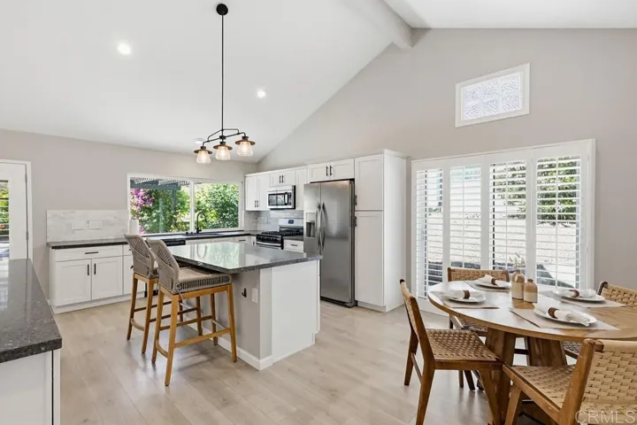 Beautifully remodeled single-story home in the highly desirable San Carlos neighborhood, showcasing thoughtful upgrades, modern finishes, and exceptional functionality throughout. The open-concept floor plan seamlessly connects the kitchen, family, and dining areas, creating an ideal space for both everyday living and entertaining. The home features high ceilings, abundant natural light, recessed lighting, a tile fireplace, laminate wood flooring, and dual-pane windows and doors. The upgraded kitchen is designed to impress with quartz countertops, ample cabinetry, stainless steel appliances, and two oversized islands—perfect for hosting and gathering. Both bathrooms have been tastefully remodeled with updated vanities and custom tile work. Additional interior upgrades include a fully insulated garage with finished flooring, plantation shutters throughout, and a whole-house water softener system. The exterior has been equally enhanced with vinyl fencing, upgraded landscaping, and poured concrete along the sides of the home for clean, low-maintenance functionality. The front and backyard feature artificial turf, and the covered patio provides a great space to relax or entertain outdoors. The home also includes central heat and A/C, along with an upgraded 200-amp electrical panel that is pre-plumbed for solar and battery backup. Ideally located near shopping, dining, Mission Trails Regional Park, and Lake Murray, this home offers a perfect balance of comfort, upgrades, and convenience.