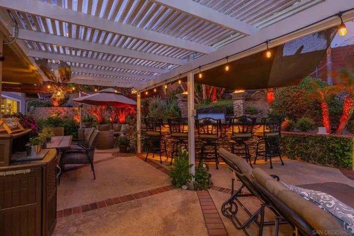 Entertainer’s Dream with Resort-Style Backyard, Ultimate PRIVACY, in Prime Location! Private oasis nestled against the serene Black Mountain Reserve. This bright, open-concept home features vaulted ceilings, 4 bedrooms, 3 full baths (1 bedroom and bath located on the 1st level), and an oversized bonus room—ideal for a home office, gym, or media space. Enjoy true indoor-outdoor living in the stunning backyard, complete with a sparkling pool, spa, waterfall, custom BBQ island with premium Delta Heat appliances, bar seating, customizable uplighting throughout, mature, tropical palm trees, bird-of-paradise, and other plants – the perfect setting for hosting or relaxing. The spacious 3-car garage offers abundant storage with built-in cabinetry, overhead racks, and a workbench. Retreat to the tranquil, island-inspired primary suite, featuring a distinctive bamboo ceiling detail, Brazilian Tigerwood flooring and a custom walk-in shower with rain shower. The updated kitchen includes new stainless steel appliances and a custom bar with a wine fridge. Located in the highly sought-after PUSD school district, minutes from Carmel Ranch Shopping Center, dining, and convenient access to I-15 and Hwy 56. No HOA or Melo Roos! Owned solar! Recent double-paned windows throughout. Dual-zone climate control. Fully-paid solar, NEM-I, zero/almost zero electric bill. All pool/spa functions controlled by app (filter on/off, pool/spa temperature, bubbles, lights, waterfall). Sprinkler system controlled by app. Outdoor electric heaters. Barbeque island has Delta Heat grill, 2-burners, refrigerator, garbage bin, paper towel compartment, storage). High-end outdoor speakers. Storage shed.
