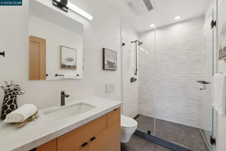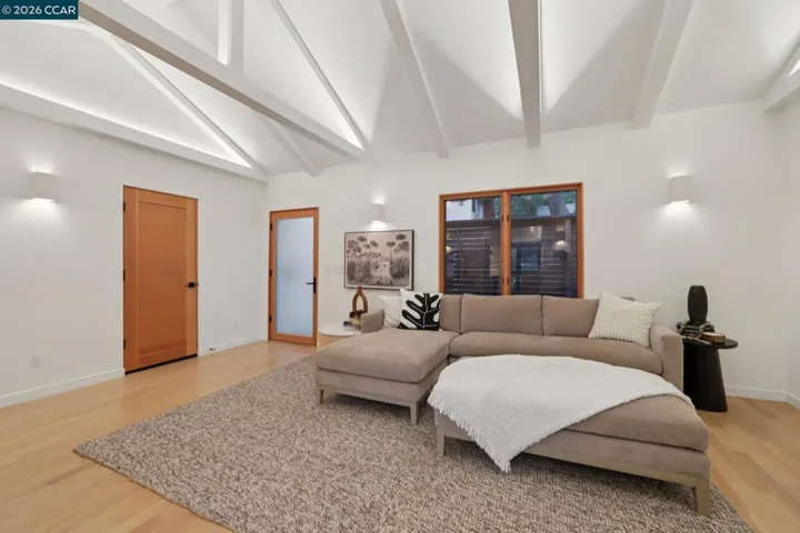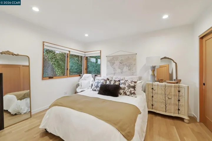 Discover eco-modern living in this 3BR/2BA Berkeley Hills home, where smart technology meets comfort. A Google Nest system, six-zone radiant heating/cooling, and passive ventilation ensure an ideal climate. Vaulted ceilings and soft LED lighting create a bright, welcoming atmosphere, while the chef’s kitchen features custom cabinetry, high-end appliances, and open shelving. The main level includes a bedroom with peaceful views, a home office with built-in desk, and a spa-inspired bathroom. An attached garage with EV charger is finished as additional living space. The lower level offers a family room perfect for entertaining, opening to a ~400 SF patio and multi-tier, low-maintenance yard, along with two bedrooms, a full bath, laundry, and storage. Ideally located near UC Berkeley, Kensington shops, Solano Avenue, Tilden Park, and AC Transit. – Home Energy Score (Exempt – all electric)