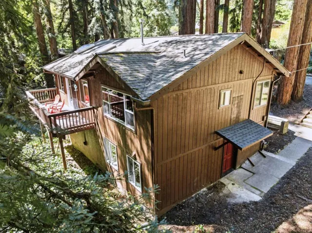 Tucked among the redwoods along a wide, year-round creek, this property offers a rare combination of privacy, flat usable land, and flexible living space on approximately 1/3 acre. With no homes across the creek, the setting feels like your own private sanctuary. Vaulted ceilings and skylights fill the home with natural light, creating a bright & inviting living space that feels larger than the square footage suggests. The open living, dining and kitchen area flows out to a sunny deck overlooking the trees and creek below, creating a seamless indoor-outdoor connection. Recent improvements include a remodeled bathroom, updated appliances, and new washer and dryer. The lower level features a private entrance and adds valuable bonus space with two large rooms, a laundry area with potential kitchenette, and an unfinished bathroom ready for your custom bath, offering great potential for separate living space. The property also includes a detached garage/workshop and a separate storage shed, providing excellent space for projects, storage, or outdoor gear. Conveniently located just minutes to town, great commute location to Santa Cruz or Silicon Valley while still enjoying the peace and beauty of the redwoods. Bonus: Septic inspection passed. Home & Pest reports are already completed.