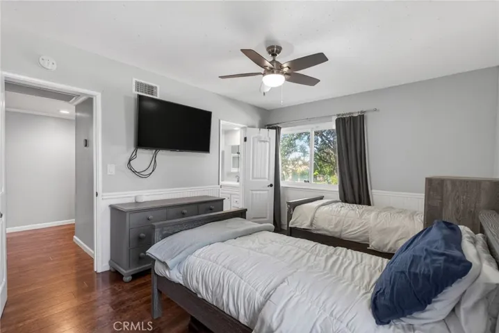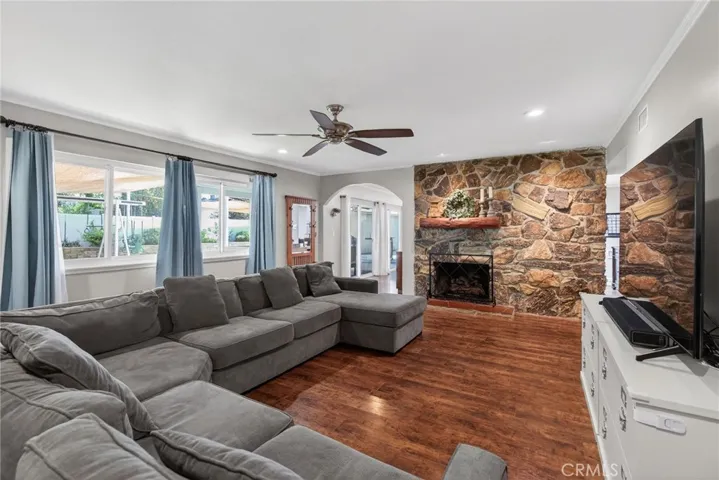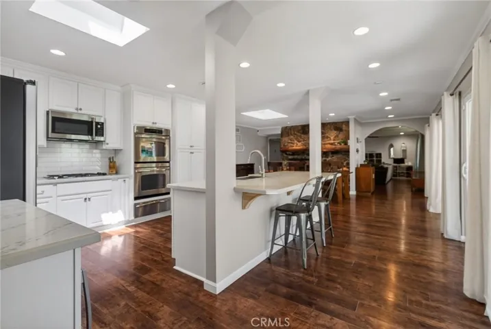 A home trending in design meets timeless craftsmanship. The newly renovated open floorplan is a showstopper, featuring a professionally curated custom kitchen ornamented with sleek stainless-steel appliances, a double oven AND A Leaven/dough riser also known as a bread warming drawer, and quartz countertops that sparkle from its cleanliness and natural light. The king-size island invites gatherings, while the dining area exudes warmth and charm, setting the stage for cherished meals. The family room, anchored by a stunning double fireplace with two personalized hand-made mantles crafted from timber from Big Bear Mountain, is the epitome of cozy luxury.