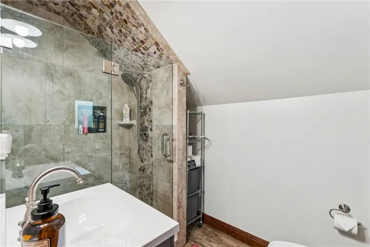 Upstairs, you’ll find all three bedrooms along with an additional fully remodeled bathroom featuring custom stonework.