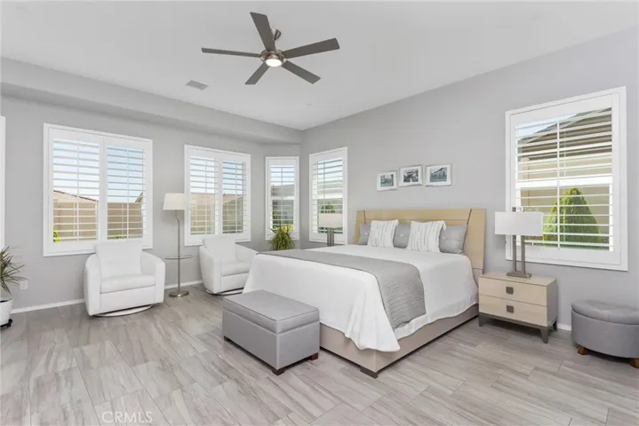 The open-concept family room is enhanced by a built-in 7-speaker surround sound system, creating an ideal space for relaxing or entertaining. Throughout the home, elegant 12” x 24” designer porcelain tile flooring and plantation shutters add a touch of sophistication and continuity.