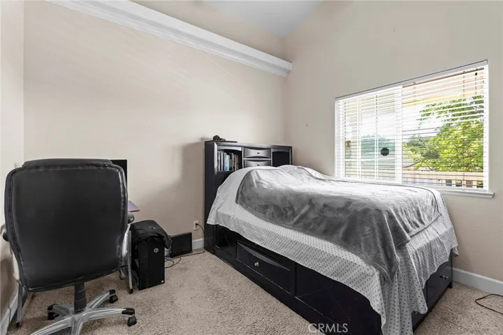 This beautiful home welcomes you with a marvelous open floor plan and soaring vaulted ceilings that make the living space feel bright, airy, and expansive. Natural light pours in, highlighting the high-end laminate wood flooring throughout the main living areas, while two bedrooms offer soft carpet for comfort and the primary suite offering updated flooring. The spacious living room features a cozy gas fireplace with a stunning built-in bookshelf, creating the perfect space to relax or gather. The kitchen is thoughtfully designed for both everyday living and entertaining, complete with granite countertops, tile backsplash, stainless steel appliances, a large pantry, two ovens for the bakers, and an eat-up bar for casual dining. The master suite is privately located on the opposite side of the home, offering a peaceful retreat. It features a spacious walk-in closet and a beautifully appointed bathroom with dual sinks, a soaking tub, and a walk-in shower with dual shower heads and updated fixtures. Both guest bedrooms are generously sized with high ceilings, and the hall bathroom includes a large vanity with double sinks and updated finishes. Step outside to a backyard designed for enjoyment, featuring a covered patio perfect for evening entertaining, raised garden beds, and mature fig and orange trees. The front of the home offers a large composite deck, ideal for sipping your morning coffee in a quiet, peaceful setting. Additional highlights include a spacious laundry room with ample storage and counter space, ceiling fans throughout, an oversized two-car garage, and a fully fenced, low-maintenance yard. Situated on a cul-de-sac in a peaceful neighborhood, this home truly has it all.