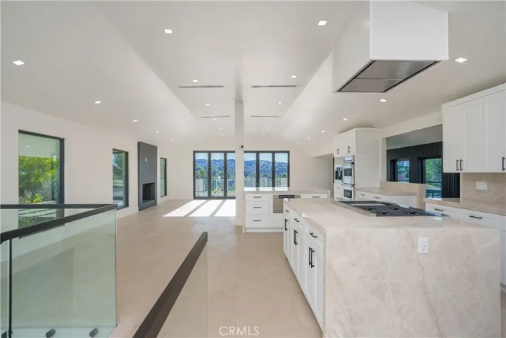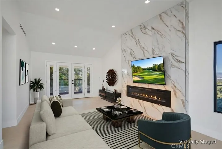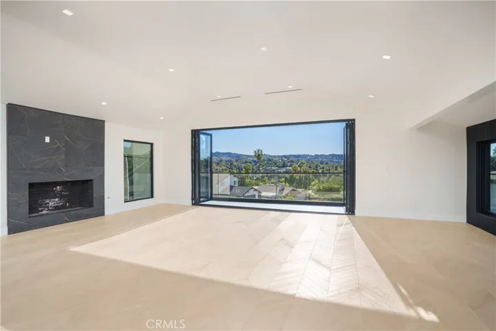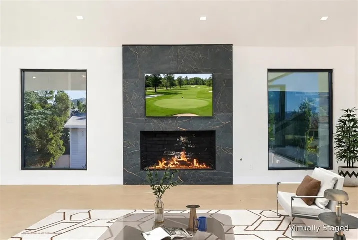 A Custom Estate home fully reimagined 3,320 sqft, set on an oversized secured flat lot, offering exceptional all new finishes. Enter through a new oversized custom pivot glass door onto 36×36 Pianetto porcelain tile, leading into the foyer. The home has been completely reimagined from wall to floors and ceilings, featuring all new finishes throughout. A new custom glass staircase, connects the levels with elegance and safety. The main upstairs living level is the designed living room, dining area, and kitchen that is surrounded by incredible views. The bi-fold accordion door opens completely from the living room to the outdoor surrounded expansive balcony, creating an indoor-outdoor vibe under the open sky. This open-concept space is centered around a grand fireplace. New Herringbone-designed flooring are throughout the home, adding warmth and sophistication. All new led lighting thoughout. The all-new Master chef’s kitchen has installed Professional Viking appliances, an extra-wide style refrigerator, dual ovens, a built-in microwave, and a Miele coffee station. Soft-closing cabinetry with oversized drawers, a barn-style accent sink, and a walk-in pantry, all topped with Taj Mahal countertops quartzite. An expanive master suite with a sitting area, an elegant quartz fireplace, a door to an outdoor balcony. The Primary bathroom is custom designed featuring dual vanities, a soaking tub, and a grand multi-jet rain shower. Luxurious tile finishes elevate the space, complemented by a smart toilet. A fully finished ex-large walk-in closet. Downstairs find 3 additional bedrooms newly upgraded, and a dedicated work-from-home office that includes direct access to the backyard— for fresh air and privacy walks. All five bathrooms have been thoughtfully designed as individual works of art, featuring new tile, high-end fixtures, and functional layouts.This custom remodel captures huge sky and valley views, along with a peek-a-boo golf course view, blending modern luxury with seamless indoor-outdoor living. The exterior showcases new smooth-finish farmhouse-style solid stucco, dual-pane black-framed windows, and custom glass railings wrapping the oversized balcony, enhancing both the views and expansive outdoor space. The planned grounds feature a new custom BBQ area with sweeping views and a newly installed Kobe Bryant-inspired multi-sport court, perfect for basketball, tennis, pickleball, or for hosting unforgettable backyard events. Welcome home.