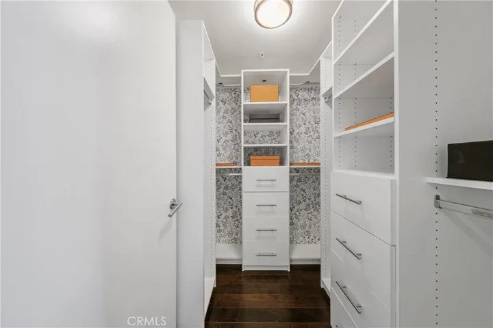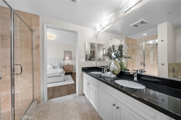 The open kitchen flows seamlessly into the dining area and features granite countertops, a gas stove, built-in microwave, stainless steel refrigerator, garbage disposal, and ample storage. A stacked washer and dryer are neatly tucked away in a louvered closet. The living room, with its oversized windows and 9ft ceiling height, is filled with natural light, creating a bright and airy atmosphere. The unit also offers abundant storage, including custom built-ins throughout. Upstairs, with no unit above, are two en-suite bedrooms, including a spacious primary suite with a walk-in closet and private bathroom. Each bedroom has its own private balcony, offering views of South Pasadena and the surrounding foothills.