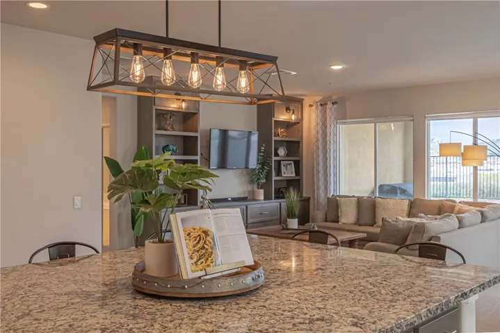 VIEWS…VIEWS…..& MORE VIEWS!!! | SINGLE STORY | CUSTOM BUILT-INS | SPACIOUS GREAT ROOM | SINGLE LOADED STREET | 3 BED + OFFICE | PRIME LOCATION!! – Welcome to this beautifully spacious single story home with VIEWS that will be hard to match!! From the moment you arrive, the inviting curb appeal with custom hardscape sets the tone for a home that effortlessly blends comfort and style. Located on a single loaded street with more incredible views out front; walking trails and a lush park await your enjoyment right across the street. Inside you’ll experience an expansive 2,164 square-foot layout featuring abundant natural light and a gorgeous great-room that so many love. The kitchen serves as the heart of the home including a massive granite island with counter seating, stunning floor to ceiling cabinetry, ample counter space, lots of storage, stainless steel appliances and a huge walk-in pantry. This all flows seamlessly into the main living area with a dazzling custom built-in entertainment center with designer lighting. The home offers 3 generously sized bedrooms and an additional office space with a beautiful custom barn door and custom built-in murphy bed/shelving unit. The primary suite is designed as a private retreat with gorgeous spa like bath and more tantalizing views of the mountains beyond and city lights below. Step outside to a versatile backyard space perfectly suited for both peaceful relaxation and entertaining family & friends. Enjoy the shade of a well-placed California room, large concrete patio, extensive hardscape, spacious side yard with custom pavers and turfed play area. Situated in one of most sought-after communities in this whole valley, Audie Murphy offers endless fun and recreation with several parks, playgrounds, sports park, skate park, basketball courts, and tennis courts. The Ranch House community clubhouse pool area is a prized feature for Audie Murphy and a complete other community pool area just right down the dedicated trail right out the front door of this amazing residence. Enjoy incredibly convenient access to top-rated local schools, access to be the 15 & 215 freeways, premier shopping and dining destinations at the well acclaimed Menifee Town Center. With its blend of suburban serenity and everyday convenience, this property is a premier destination for those seeking a vibrant atmosphere to call home.