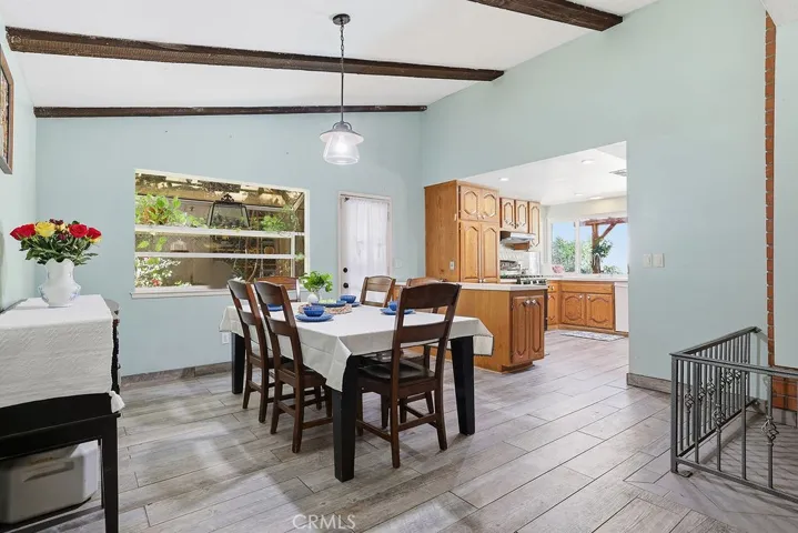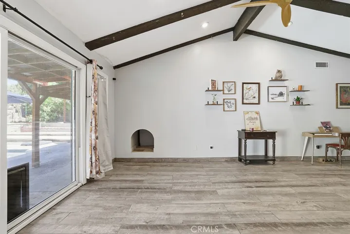 Charming single-story pool home in Canyon Country, ideally located near the desirable Sand Canyon Plaza shopping center, and well-rated schools with easy commuter access. Situated on a corner lot. This 3 bedroom, 2 bathroom home features an open-concept layout with exposed wood beam ceilings, a statement brick fireplace, recessed lighting throughout, ceiling fans, newer laminate and tile flooring plus so much natural light! Spacious living and dining areas flow seamlessly with large sliding glass doors creating effortless indoor-outdoor living.