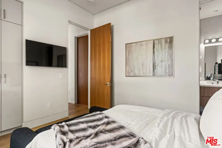 A stunning modern residence set on an expansive, flat lot. This 5-bedroom, 6-bath oasis was thoughtfully designed to combine open-concept living with generous space for both entertaining and privacy. Enter through the 10-foot entry door into an open layout featuring wide-plank European oak floors, high ceilings throughout, and a custom floating glass staircase. The main living area flows seamlessly between the formal dining room with built-in buffet, the living room centered around a floor-to-ceiling marble fireplace, and a contemporary kitchen showcasing custom cabinetry, quartz countertops, high-end appliances, and dual islands designed for gourmet cooking and entertaining. The primary suite serves as a private retreat, featuring a marble fireplace, balcony overlooking the yard, spacious walk-in closet, and a spa-inspired bathroom. Full-length glass pocket doors open to a resort-style backyard with a zero-edge pool, spa, fire pit, built-in grill, and a pool house with its own bath offering the potential for conversion to an ADU, private recording studio, office, or creative workspace. A guest bedroom is conveniently located on the main level, while upstairs features additional bedrooms including a guest suite, a lofted landing with custom built-ins, and a spacious gym that can also serve as an additional bedroom. The upper level also includes a home theater with its own bath, providing flexibility to be used as another bedroom or entertainment space. A well-appointed laundry room adds everyday convenience. Upgrades include electric blinds, a smart home system, custom lighting, security cameras, and more. This exceptional home seamlessly blends luxury, functionality, and style, offering an unparalleled living experience.