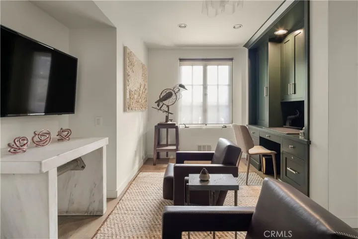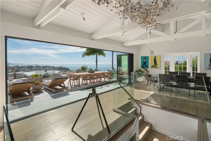 The main living level seamlessly blends indoor and outdoor living. Expansive living and dining areas open to the terrace through a wall-to-wall La Cantina glass door system, creating a stunning connection to the outdoors. Nearly 700 square feet of ocean-view terrace space provides the ideal setting for entertaining or unwinding while enjoying sweeping vistas of Emerald Bay’s whitewater coastline, the Dana Point Headlands, Laguna Beach city lights, and unforgettable sunsets.