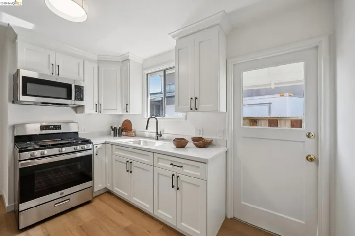 Welcome to your smart entry point into Alameda’s coveted East End! This completely remodeled duplex at 3241 Briggs offers two pristine 2BR/1BA units, each with attached garage and wood-burning fireplace. Unit A features two-story living with hardwood floors throughout. The modern kitchen shines with quartz countertops, white cabinets, and brand-new stainless appliances. Unit B flows beautifully on a single level with matching kitchen finishes, perfect for those seeking everything on one floor. Both units showcase fresh updates throughout including new kitchens, bathrooms, flooring, paint, and fixtures. The unique trapezoid-shaped lot offers an excellent opportunity for creative front yard spaces for each unit. Located just two blocks from beloved Lincoln Park (baseball, pickleball, pool), and near twelve years of top-rated schools, the golf course, South Shore Shopping Center, Oakland Airport, and ferry service. The neighbors throw an annual block party together – real community, not just people who live near each other. Perfect for first-time investors, those seeking rental income with owner-occupancy, or down-sizers wanting single level living with investment potential.