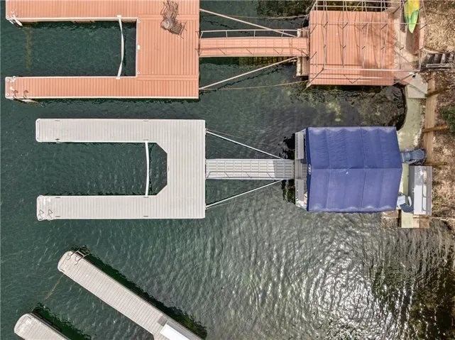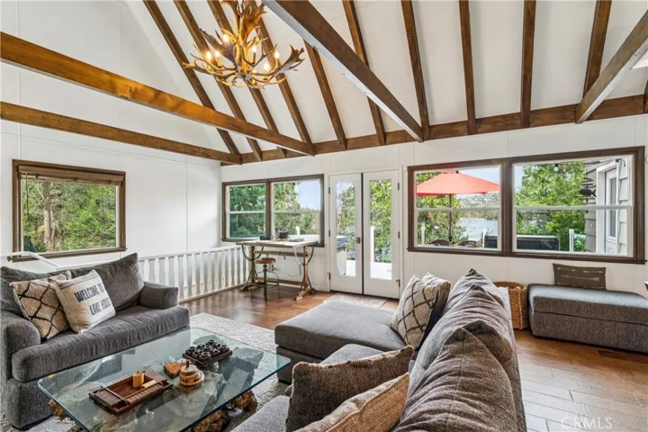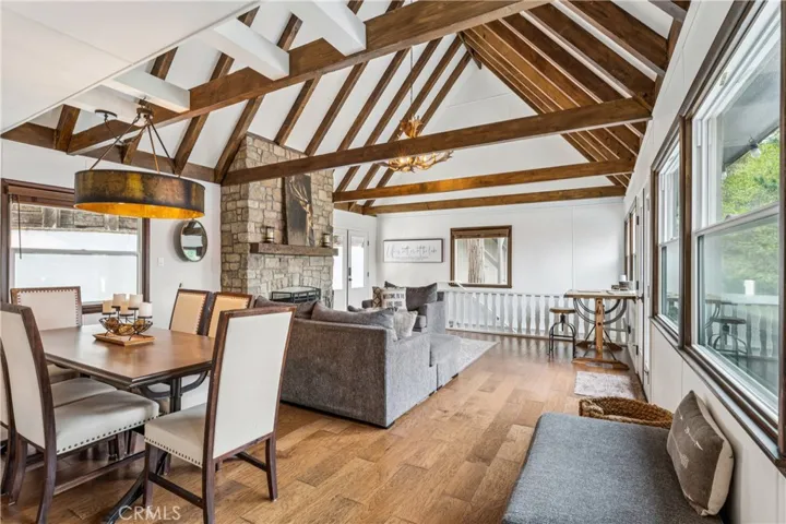 Experience elevated mountain living in the beautifully maintained and updated 4 bedroom 3 bath home lake front home located in the coveted Palisades neighborhood of Lake Arrowhead. Offered fully furnished, this home blends simple elegance with relaxed comfort. The open concept interior is highlighted by soaring cathedral ceilings and expansive windows bringing in abundant light. A striking stone fireplace anchors the living space which is complemented by rich hickory wood flooring throughout. The gourmet kitchen is both stylish and functional, featuring quartz countertops, an unbelievable La Cornue range, and custom finishes designed for everyday function and luxury. With well appointed bedrooms and bathrooms on each level with one of the bedrooms easily converting to a spacious family room with two Murphy beds, this home is perfect for accommodating family and guests. Outdoor living is equally great with a large deck ideal for enjoying morning and evening outdoor dining all while taking in the tranquil lake views. Relax in the hot tub or stroll to your private single slip dock. This dock sports a generous beach area ideal for swimming and family enjoyment. Rare and ample parking of 6 spaces suitable for even boat parking that is level with the street and a location that is minutes from Lake Arrowhead Village, the Marina, and Cedar Glen, this home offers both convenience and exclusivity. A boat is available for separate purchase, completing this exception Lake Arrowhead opportunity.