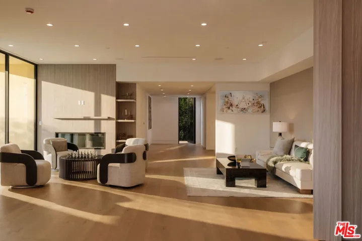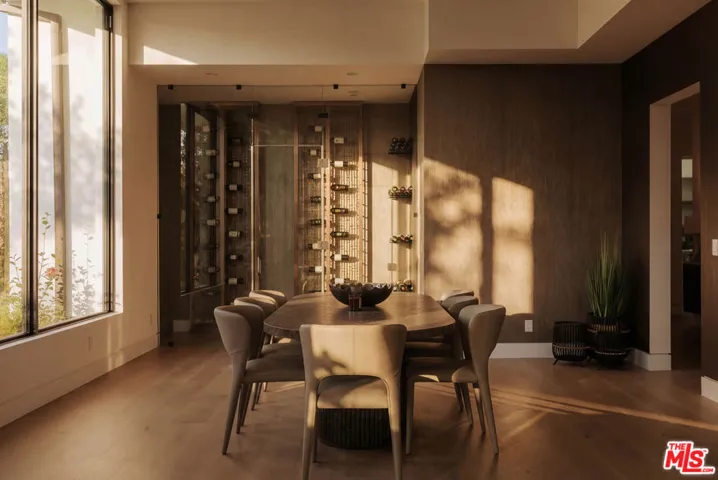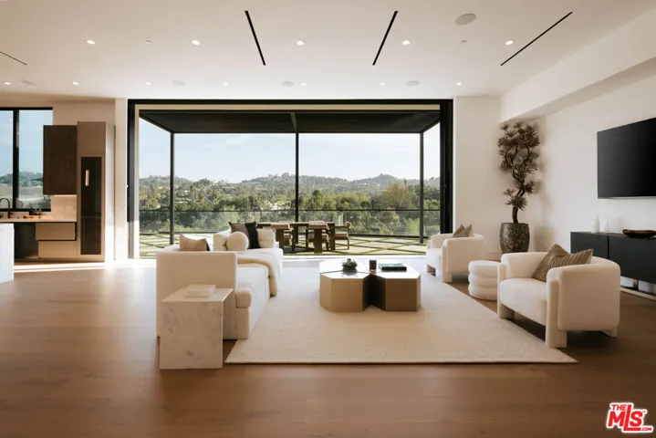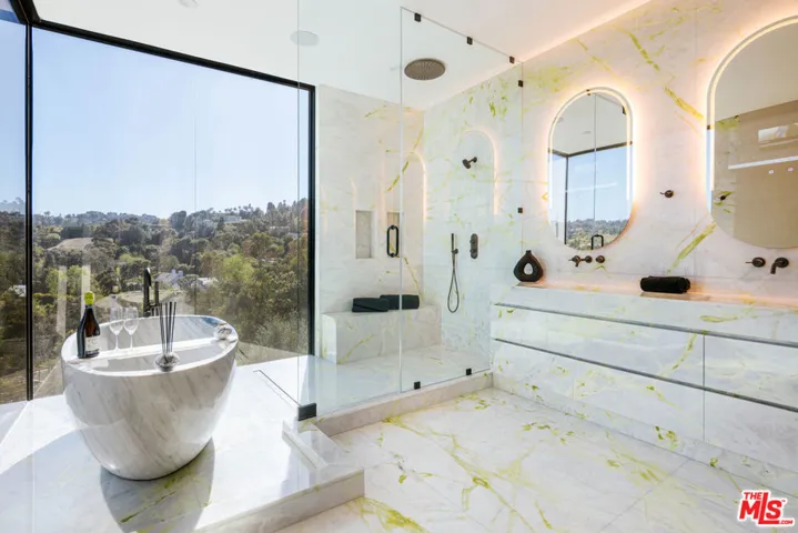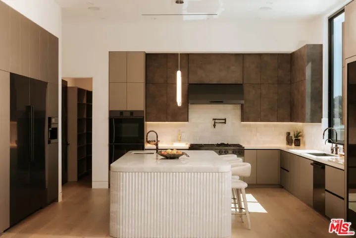 Welcome to a truly exceptional estate in the prestigious Royal Oaks enclave of Encino, where elevated design, breathtaking views, and modern luxury come together seamlessly. Meticulously curated materials and finishes are showcased throughout this five bedroom plus an office, nine bathroom residence. Upon entry, soaring ceilings, expansive walls of glass, and a light-filled open layout create a seamless connection to the surrounding landscape. A striking titanium gold staircase with an integrated water feature serves as a sculptural centerpiece, setting the tone for the level of design and detail carried throughout. The formal dining room is complemented by a temperature-controlled wine cellar, while a nearby powder room is finished in Brazilian green marble, adding a refined touch. The culinary experience is elevated through a dual-kitchen concept. The main kitchen showcases a fluted natural stone island and white onyx countertops paired with custom German cabinetry, finished with aluminum and leather accents. A secondary kitchen provides additional functionality, ideal for both everyday living and entertaining. The primary suite serves as a private sanctuary, capturing stunning views and offering a spa-inspired bathroom with bookmatched stone. Designed for both wellness and entertainment, the home features an indoor sports court ideal for racquetball or basketball, a game room, and a fully equipped fitness area with a red light sauna and cold plunge. A private theater and expansive entertainment level with a custom bar finished in agate blue stone create the perfect setting for hosting, seamlessly opening to outdoor living spaces. The outdoor setting features an infinity edge pool, and a rooftop deck, all designed to enhance the overall sense of luxury and relaxation. This new construction estate offers a rare combination of scale, design, and lifestyle in one of Encino’s most sought-after neighborhoods.Additional features include a five car garage with high ceilings, elevator, and Control4 smart home automation system.This is a rare opportunity to own a statement property where design, views, and lifestyle converge at the highest level.
