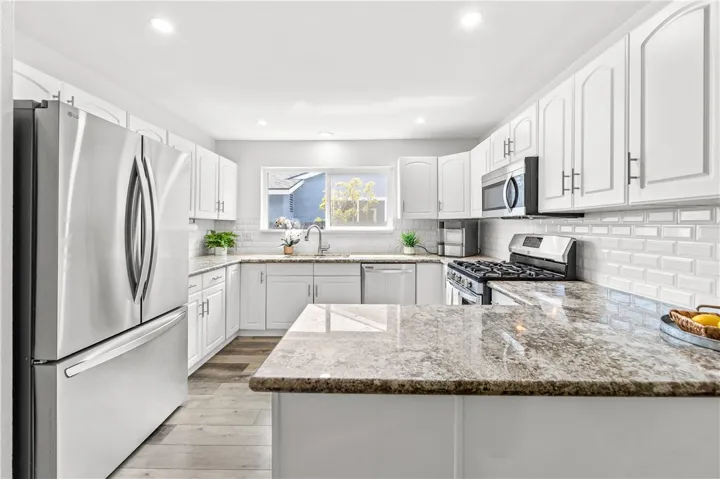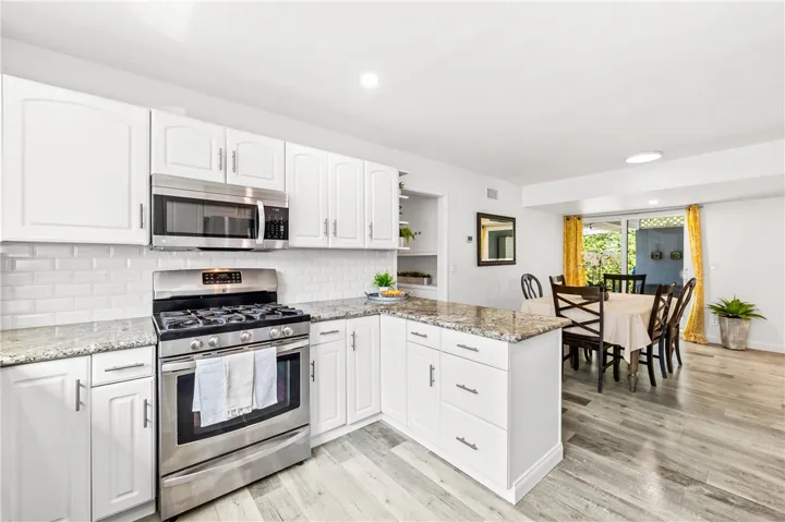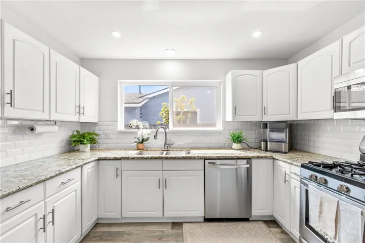 Designed for both everyday living and effortless entertaining, the inviting living room is anchored by a charming brick fireplace, and features vaulted ceilings, this space offers the perfect setting for cozy evenings at home. The remodeled kitchen has been remodeled with both style and functionality in mind, with white cabiinets and grantie countertops that provide a clean, open space to gather, cook, and connect.