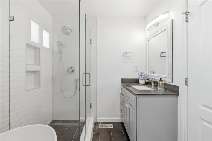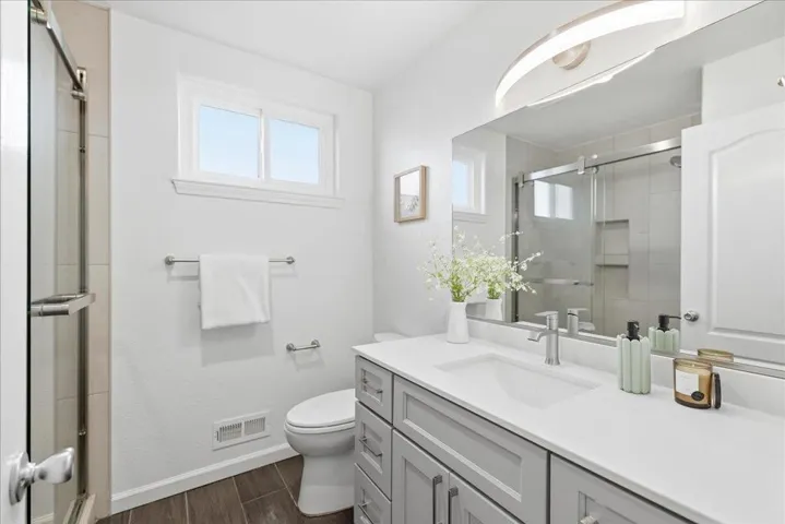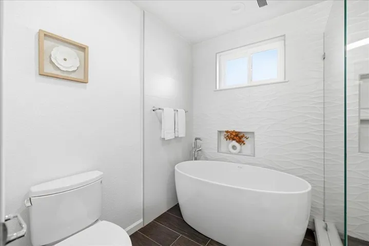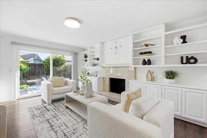 Beautifully updated single-story home minutes from top rated Cupertino schools, Santana Row & Apple Campus featuring a bright, light-filled interior & functional layout with luxury vinyl and tile flooring. Spacious living & family room with fireplace, built-in white cabinetry, recessed ceiling lighting, and large picture window. A sliding glass door provides seamless indoor-outdoor flow. Formal dining area enhanced by skylights with integrated track lighting. Bright galley-style eat-in kitchen showcases white shaker-style cabinetry, full tile backsplash, window above sink, and stainless steel appliances including refrigerator, cooktop, hood, built-in Bosch wall oven, & dishwasher. Spacious bedrooms offer built-in closets. Primary bathroom features a freestanding soaking tub, frameless glass shower enclosure with dual shower heads (rain + handheld), built-in recessed shower niches, linear drain, vanity, & consistent designer tile work. Additional highlights include a dedicated laundry area & thoughtfully designed living spaces throughout. Fenced backyard with lush lawn, concrete patio, raised planter area, & mature greenery, perfect for entertaining or relaxation. Low-maintenance landscaping & attached 2-car garage complete this move-in ready home.