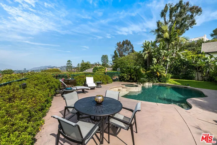 Nestled in the exclusive 24-hour guard-gated enclave of The Summit above Beverly Hills, the magnificent Contemporary Villa offers the ultimate in privacy, luxury, and serenity, all just minutes from the vibrant heart of Beverly Hills and Studio City. Situated atop a small knoll at the end of a peaceful cul-de-sac on a premier corner lot, the graceful estate features spectacular city, canyon, and mountain views, providing a sense of tranquility, charm, comfort, and privacy in one of Los Angeles’ most exclusive enclaves. This timeless estate spans just under 7,000 sq.ft. on an approx. 16,216 sq.ft. lot, perfectly blending modern luxury with classic architectural detail. A grand arched entry with intricate textured glass and palm frond sculpted iron double front doors open to a formal foyer with travertine floors and a sweeping curved staircase, setting the tone for the sophistication found throughout. The formal living room impresses with soaring two-story ceilings, a stately fireplace, built-in granite bar, and walls of arched windows and glass doors that flood the space with natural light and open to the backyard oasis. Every ceiling is sculptural. Heated floors in both the living room and gourmet kitchen add comfort and refinement. Art lovers will appreciate the abundant wall space and thoughtful niches throughout the home, perfect for displaying a curated collection. The large formal dining room features a long built-in buffet with cabinetry, and matching arched ceiling, ideal for elegant entertaining. The chef’s kitchen featuring two clear-span curved glass windows is equipped with professional-grade appliances, a large granite center island, and an adjoining breakfast room that seamlessly flows into the inviting family room. A powder room, guest bedroom and bathroom, media/screening room, and laundry room complete the lower level. Upstairs, two spacious guest or family bedrooms each offer ensuite baths, while the expansive primary suite is a true sanctuary, complete with private balconies overlooking breathtaking vistas, massive dual custom walk-in closets, and a marble-clad bath featuring dual vanities and commodes, a soaking tub, separate steam shower, and an adjoining gym. The resort-like backyard is an entertainer’s dream, with generous patio space surrounding the pool and spa, tropical-inspired landscaping, and grass area, all set against the dramatic backdrop of panoramic views. A three-car attached garage provides ample space for vehicles and storage. Offering an exceptional lifestyle in a secure, sought-after community, this remarkable estate embodies peaceful, private living with effortless access to all the best of Beverly Hills and beyond.
